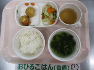 ご飯、つくね焼き、キャベツのサラダ、チンゲン菜とコーンのスープ
