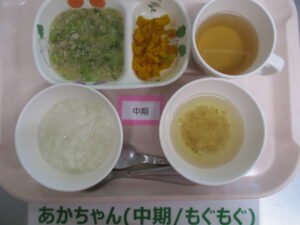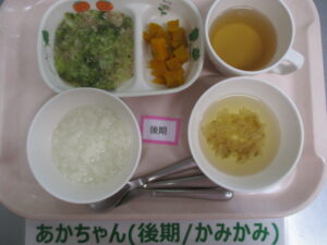 【中期食】パン粥、ツナとブロッコリーの煮物、かぼちゃ煮、もやしのスープ