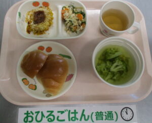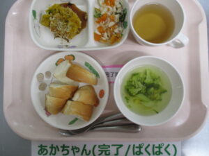 ロールパン、スコップかぼちゃコロッケ、ささみサラダ、ブロッコリーのスープ