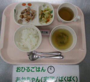 【完了食】軟飯、バーベキューチキン、白菜のなめ茸和え、わかめともやしの味噌汁