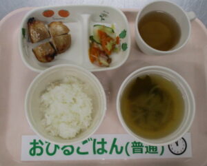ご飯、バーベキューチキン、白菜のなめ茸和え、わかめともやしの味噌汁