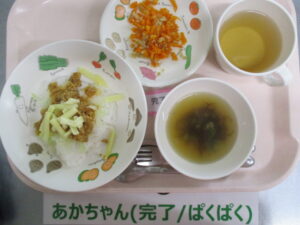 【後期食】五倍粥、ツナとキャベツの煮物、人参スティック、もやしのスープ