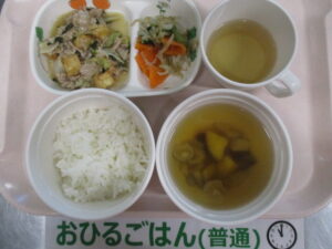 ご飯、厚揚げと豚肉の味噌炒め、チンゲン菜のお浸し、さつまいもとしめじのすまし汁