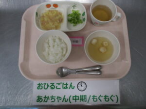 【中期食】五倍粥、ツナとじゃがいもの煮物、きゅうり煮、麩のすまし汁