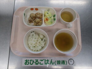 わかめご飯、鶏のから揚げ、ポテトサラダ、ウインナーときのこの中華スープ