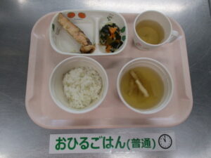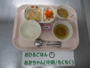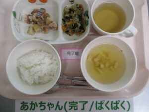【中期食】五倍粥、鮭と大根の煮物、人参煮、もやしのすまし汁