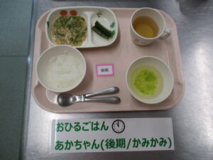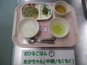 【中期食】五倍粥、ツナとピーマンの煮物、きゅうり煮、キャベツのスープ
