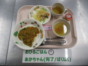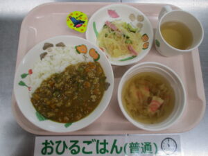 キーマカレーライス、春雨サラダ、中華スープ、ゼリー