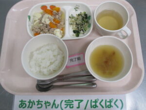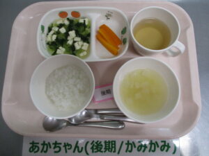 【後期食】五倍粥、豆腐と小松菜の煮物、人参スティック、玉ねぎの味噌汁
