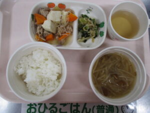 ご飯、肉豆腐、磯香和え、切干大根となめこの味噌汁