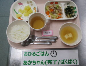 【後期食】五倍粥、豆腐とほうれん草の煮物、キャベツ煮、もやしの味噌汁