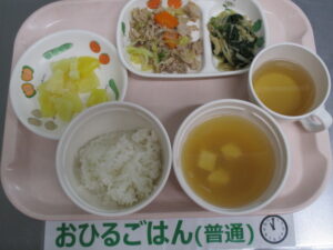 ご飯、豚肉の焼肉炒め、ほうれん草と竹輪のごま和え、豆腐と長ねぎの味噌汁、パイン缶