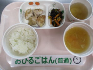 ご飯、鶏肉のごまダレ焼き、ひじきサラダ、キャベツと人参の味噌汁