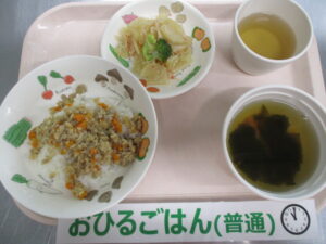 大豆ミート入り味噌そぼろ丼、カニカマサラダ、わかめとかまぼこのすまし汁