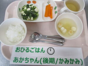 【後期食】五倍粥、豆腐とチンゲン菜の煮物、人参スティック、麩の味噌汁