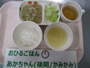 【後期食】五倍粥、鶏ひき肉となすの煮物、キャベツ煮、玉ねぎの味噌汁