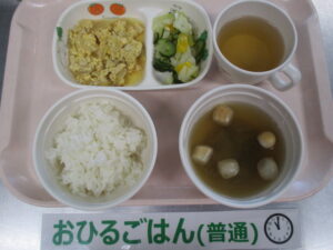 ご飯、高野豆腐の卵とじ、キャベツのサラダ、なすと麩の味噌汁