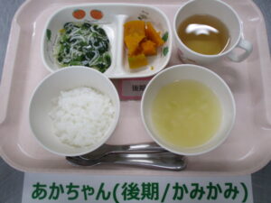 【後期食】五倍粥、しらすと小松菜の煮物、かぼちゃ煮、玉ねぎの味噌汁