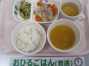 麦ご飯、豚肉のすき焼き風、なめ茸和え、かぼちゃと玉ねぎの味噌汁