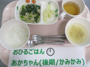 【後期食】五倍粥、鶏ひき肉とほうれん草の煮物、じゃが芋煮、もやしの味噌汁