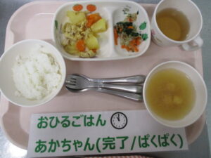 麦ご飯、洋風カレー肉じゃが、ほうれん草ともやしのナムル、厚揚げとコーンの味噌汁