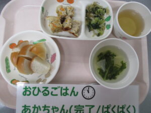 【後期食】パン粥、豚ひき肉ともやしの煮物、大根スティック、チンゲン菜のスープ