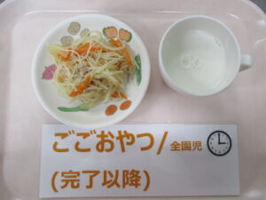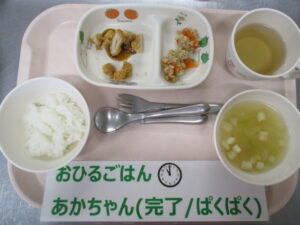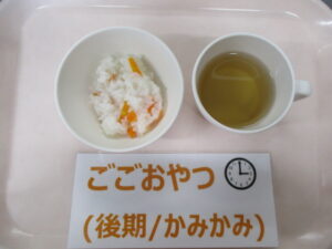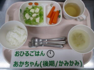 【後期食】五倍粥、豆腐とキャベツの煮物、人参スティック、もやしの味噌汁