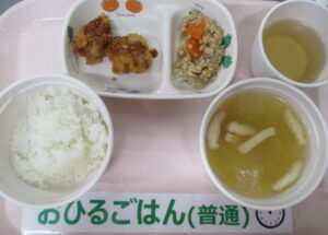 〈メニュー〉ご飯、チキンカツ、納豆和え、キャベツと油揚げの味噌汁