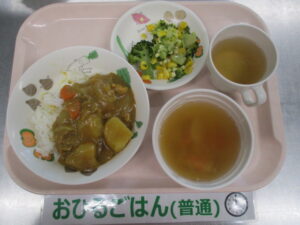 〈メニュー〉カレーライス、ブロッコリーとチーズのサラダ、中華スープ