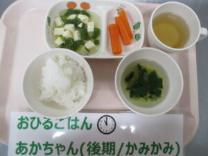 【後期食】五倍粥、豆腐とピーマンの煮物、人参スティック、チンゲン菜のスープ