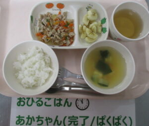 〈メニュー〉ご飯、チャプチェ、カニカマとチンゲン菜のスープ、バナナ