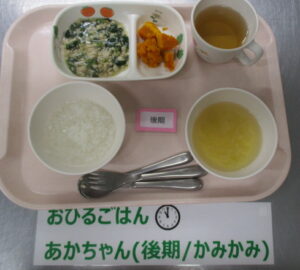 【後期食】五倍粥、鶏ひき肉とほうれん草の煮物、蒸しかぼちゃ、玉ねぎのすまし汁