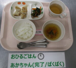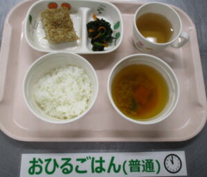 〈メニュー〉ご飯、松風焼、三食和え、かぼちゃとえのきのすまし汁