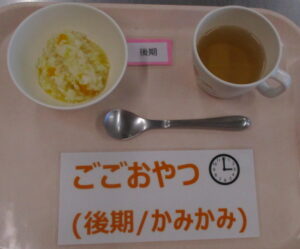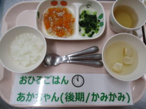 【後期食】五倍粥、鶏ひき肉と人参の煮物、小松菜煮、麩のすまし汁