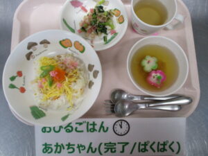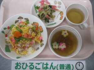 〈メニュー〉ちらし寿司、千草和え、花麩とえのきのすまし汁