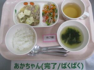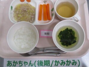 【後期食】五倍粥、鶏ひき肉と白菜の煮物、人参スティック、ほうれん草のスープ