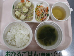 ご飯、麻婆白菜豆腐、ビーフンサラダ、もやしとほうれん草の中華スープ