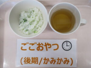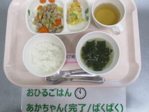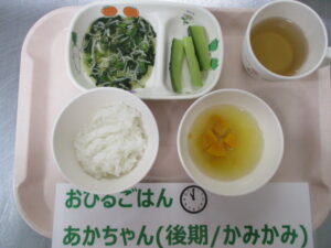 【後期食】五倍粥、しらすとほうれん草の煮物、きゅうりスティック、かぼちゃの味噌汁