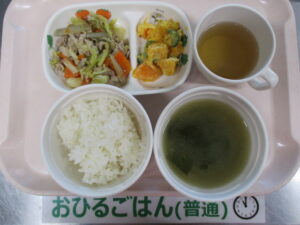 ご飯、豚肉の甘辛いため、バターナッツかぼちゃサラダ、切干大根とほうれん草の味噌汁