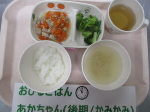 【後期食】五倍粥、鶏ひき肉と人参の煮物、ブロッコリー、もやしの味噌汁