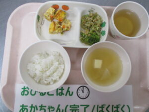【完了食】軟飯、そぼろ入り卵焼き、もやしとブロッコリーのお浸し、大根の味噌汁