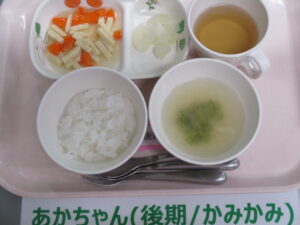 【後期食】五倍粥、高野豆腐と人参の煮物、玉ねぎ煮、いんげんの味噌汁