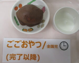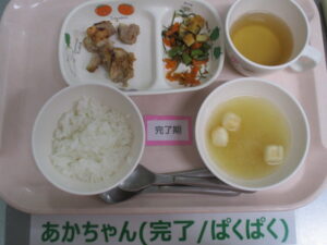 【完了食】軟飯、鶏肉のごまダレ焼き、すき昆布煮、麩と玉ねぎの味噌汁