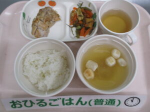 ご飯、鶏肉のごまダレ焼き、すき昆布煮、麩と玉ねぎの味噌汁