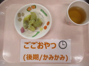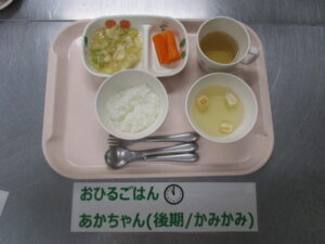 【後期食】五倍粥、白身魚と白菜の煮物、人参スティック、麩のすまし汁