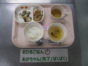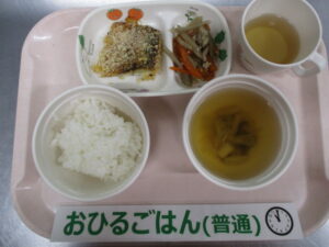 ご飯、鯖のチーズパン粉焼き、鶏肉入りきんぴらごぼう、白紙としめじのすまし汁