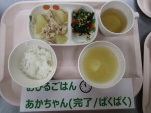 【後期食】五倍粥、ツナとじゃが芋の煮物、大根スティック、玉ねぎの味噌汁