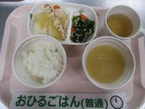 ご飯、鶏大根、納豆和え、じゃが芋と玉ねぎの味噌汁