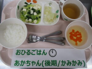 【後期食】五倍粥、豆腐とチンゲン菜の煮物、玉ねぎ煮、人参のすまし汁
