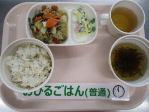 麦ご飯、八宝菜、マカロニサラダ、もずくのすまし汁
